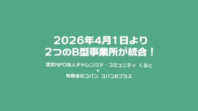 認定NPO法人チャレンジド・コミュニティ〔くると〕と有限会社コパン〔コパンBプラス〕のふたつの就労継続支援B型事業所が統合いたしました。